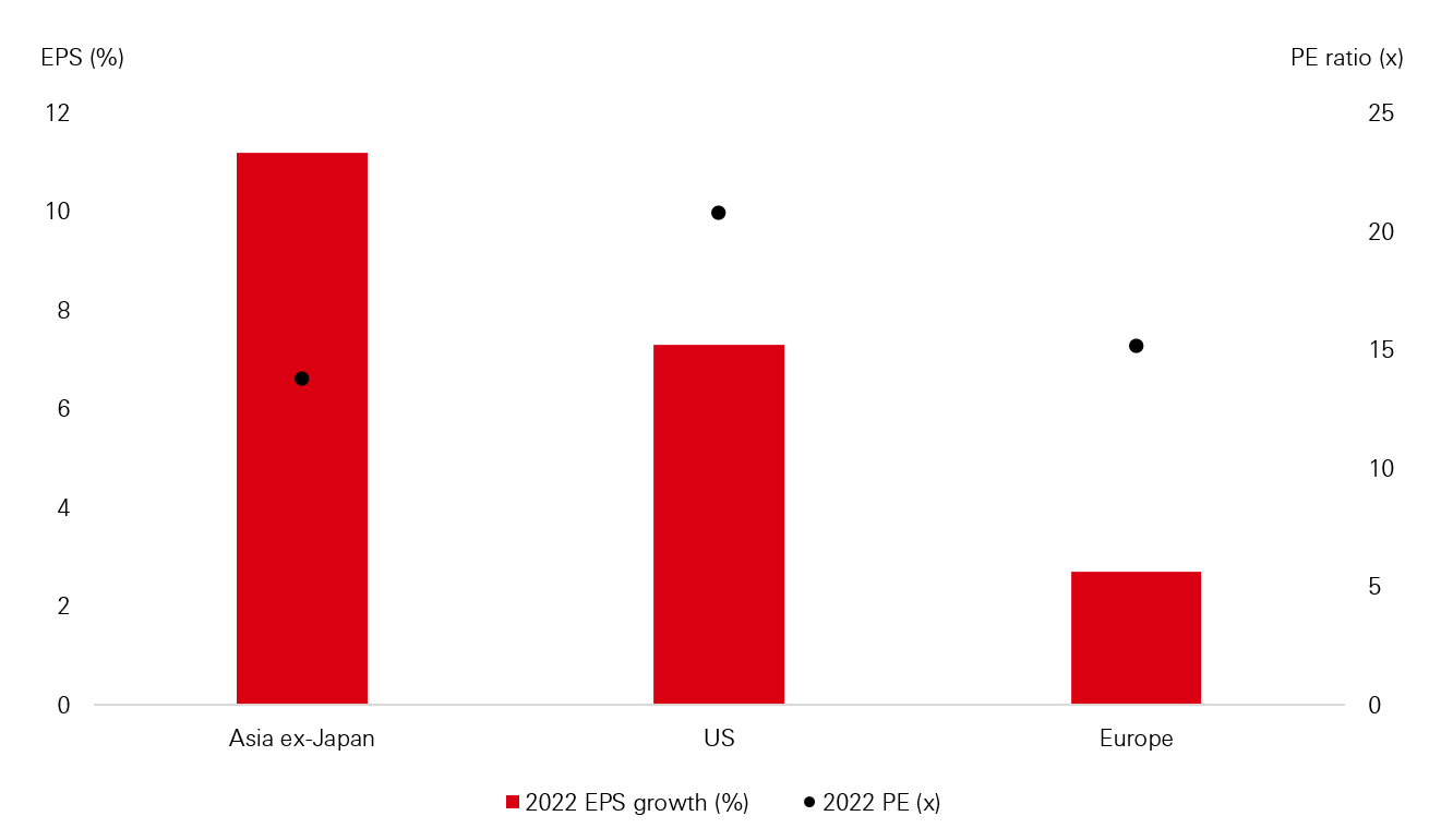 Forecasted earnings growth for Asia ex-Japan equities averages 11.2% in 2022, compared with 7.3% and 2.7% for US and European equities for the same period