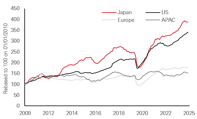 - Asian equities have had a relatively positive start to the year, following notable stability in 2024 amidst varying performance across the region driven by unique economic conditions