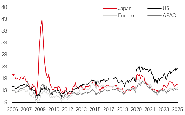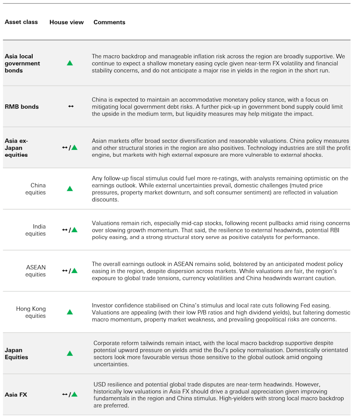 Overall, we believe current valuations for Asian equities make them worthy of attention. The combination of proactive fiscal policies, structural reforms, and rising domestic consumption is expected to support long-term growth. China’s shift towards high-end manufacturing, India’s infrastructure boom, and Southeast Asia’s increasing prominence in global supply chains all provide diversified opportunities for investors. Separately, Japanese equities offer a relatively unique mix of growth and inexpensive valuations in developed markets.