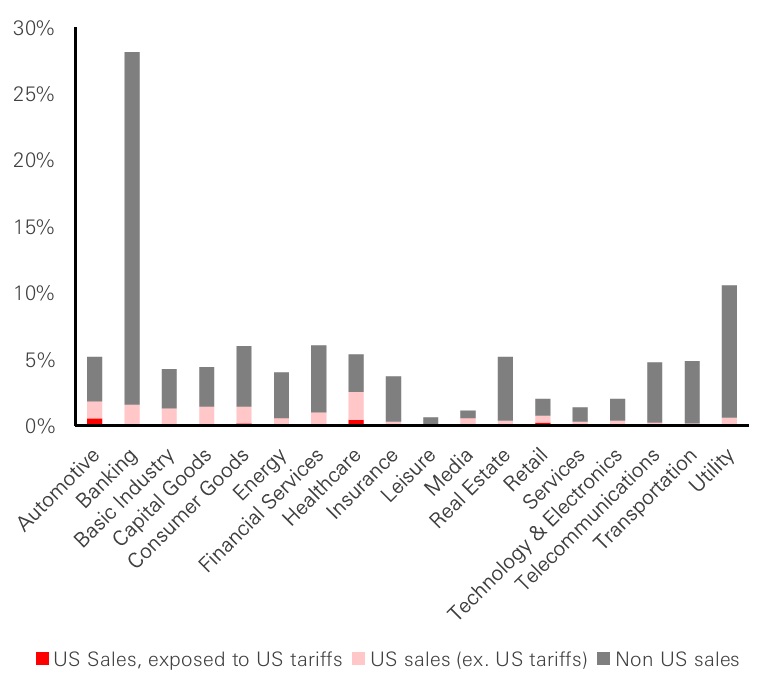 Figure 1: EUR IG Corp - Breakdown by sector, sales exposures to US tariffs