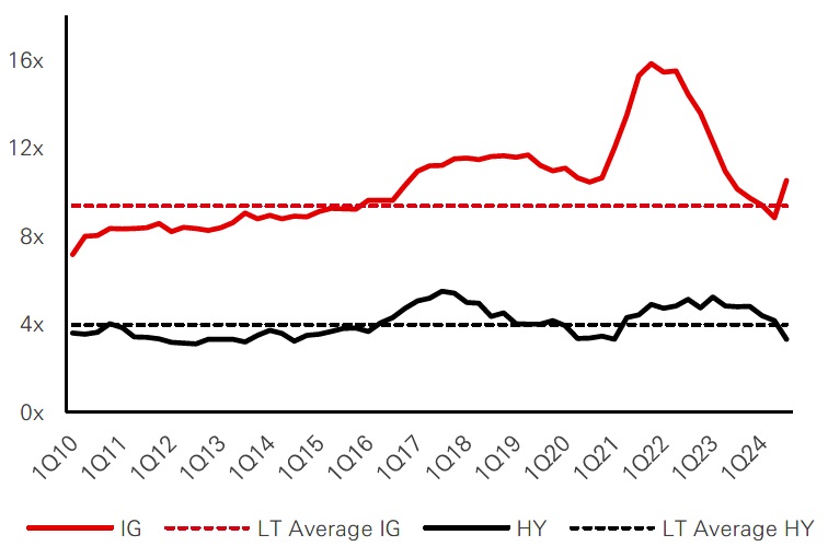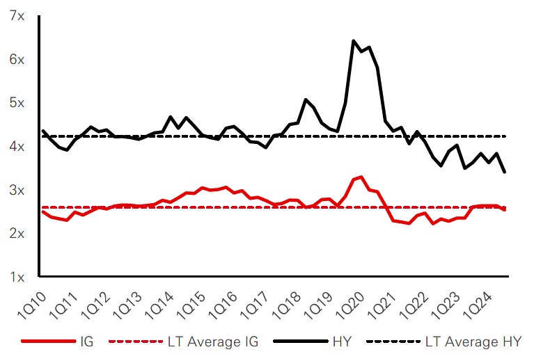 Coverage ratios have slightly declined as low coupon bonds are refinanced, but are close to long term averages, while cash-to-debt ratios remain relatively high compared to history, especially in High Yield, with companies maintaining substantial cash buffers to cushion any potential downturn.