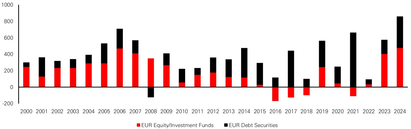 Figure 1: Change in portfolio positioning (EUR bn) – Foreign holdings of EUR debt securities, equities and investment funds