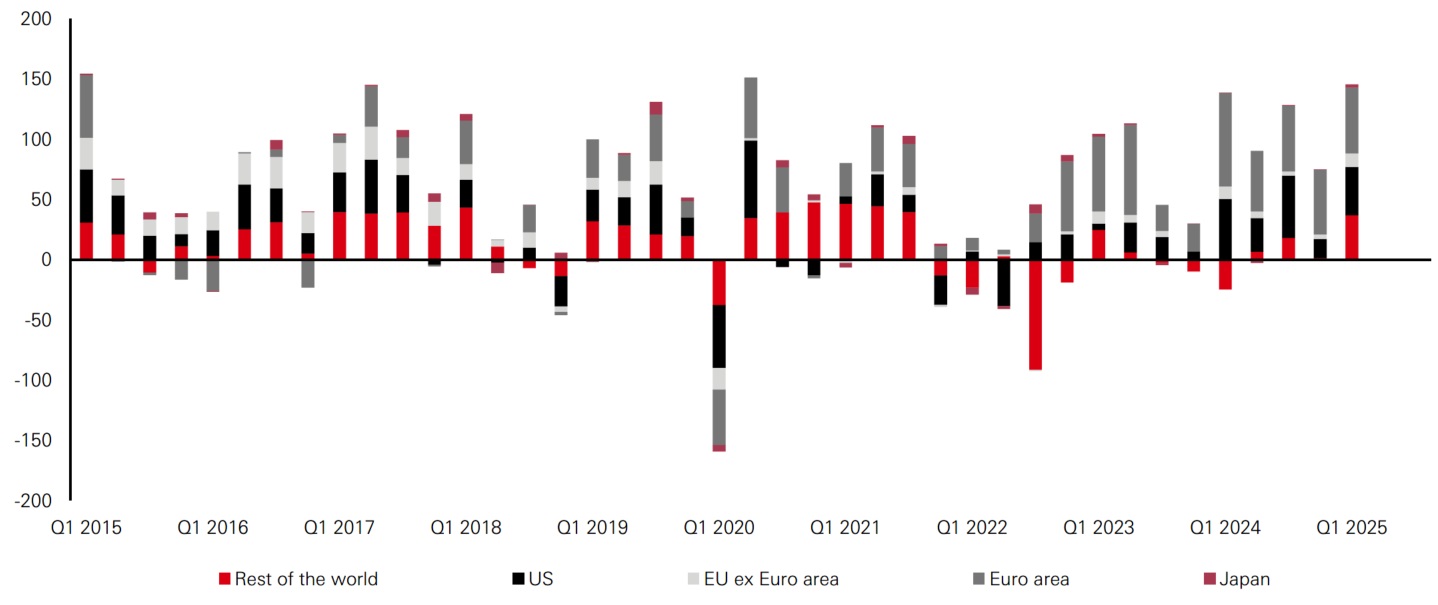 European investors reflect similar dynamics. Pension funds have increased their unhedged exposure to US equities, with assets close to USD 800bn by some estimates, and have benefited from the strong performance of the US dollar. However, just as in Asia, reliance on US assets poses risks if sentiment deteriorates, potentially leading to increased hedging or investment reallocation.