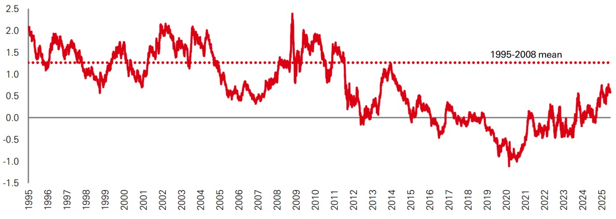 When combined with the deteriorating trend in public finances, investors are likely to require greater compensation for inflation and other risk involved in holding US public debt. Indeed, this already appears to be playing out with the term premium on US Treasuries having been on a rising trend since 2020. Nonetheless, the premium remains well below historical averages, suggesting further potential upside over the coming years.