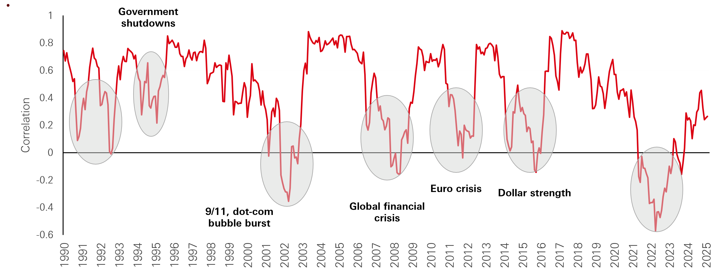 Government bonds have long been the default safe haven, but the sharp, simultaneous losses in both equities and bonds in 2022 have refocused attention on their positive correlation. It is important to note, however, that the stock–bond correlation is dynamic and dependent on the macro regime, which in turn determines how effective bonds are as an equity hedge. Typically, when real rates are rising and inflation risk dominates, stock–bond correlations tend to increase; when growth risks rise and monetary policy turns more accommodative, flight to quality flows typically push correlations lower.