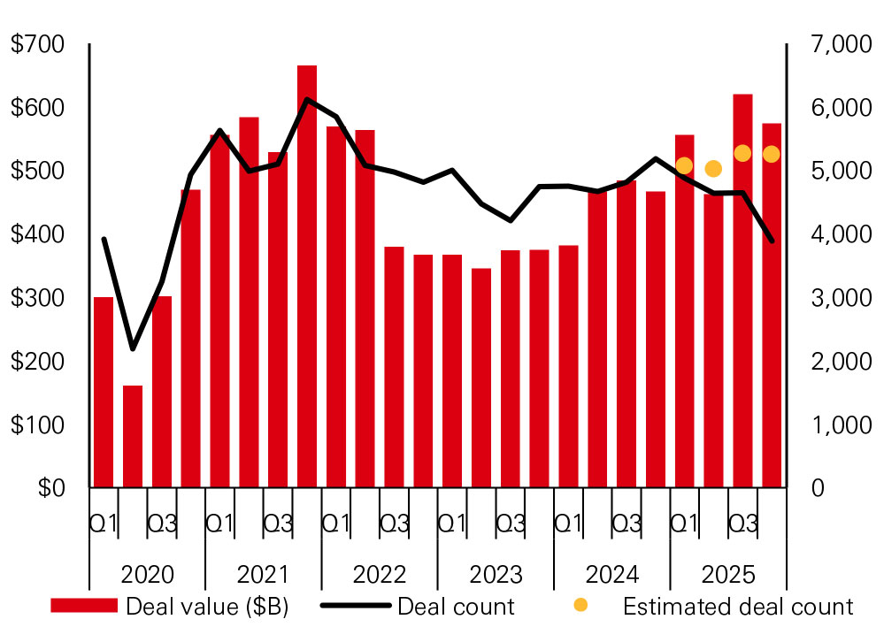 2025 has been the strongest year for exits since 2021. Exit value over the year was USD1.35tn, 50 per cent higher than in 2024. Exit count rose over 5 per cent in 2025 compared to 2024. Q4 2025 saw total exit value rising to USD446.7 billion, the highest level since Q2 2021, with technology and healthcare sectors leading the way. Among the key drivers of strong exit activity in H2 2025 has been a resurgence in M&A. There was a strong rebound in M&A, which reached a record high of nearly USD5 trillion in deal value in 2025, driven by several billion-dollar-plus transactions. IPOs are also recovering.
